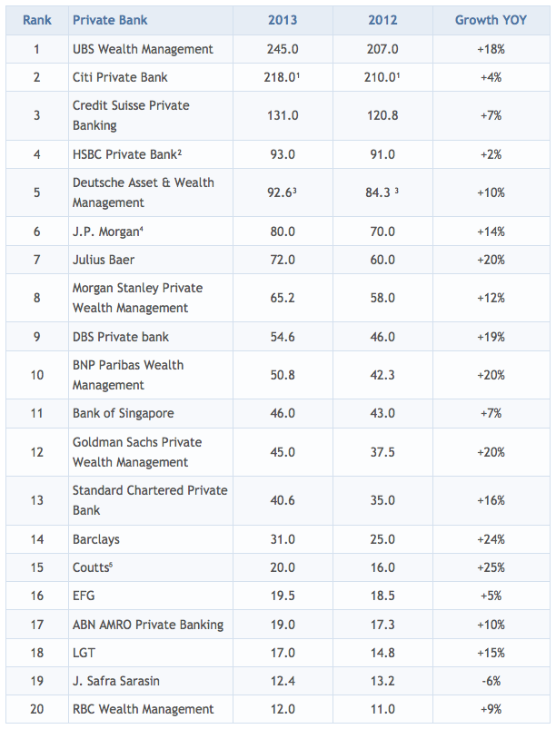 Nachgerade als Wachstums-Champions nehmen sich jedoch zwei ausländische Institute aus. So wuchs die britische Coutts, deren Asien-Geschäft von der Schweiz aus geführt wird, um ganze 25 Prozent. Und die ebenfalls britische Barclays zog 2013 rund 24 Prozent mehr Kundengelder an.