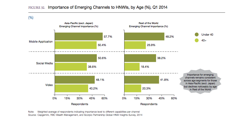 Mobile Applikationen und Social Media wiederum sind vor allem bei den über 40-jährigen Reichen im asiatisch-pazifischen Raum beliebter als in der restlichen Welt, wie die nachfolgende Grafik zeigt. Besonders bei Vermögenden aus China und Indonesien ist der Wunsch nach digitaler Interaktion sehr hoch.