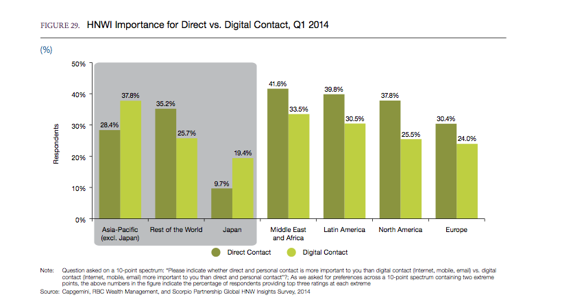 Die Studie zeigt zudem, dass sehr wohlhabende Asiaten die digitale Kommunikation via Internet, Mobile und E-Mail dem direkten Kontakt vorziehen, wie die nachstehende Grafik illustriert.
