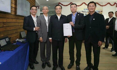 An einer kleinen Zeremonie am vergangenen Wochenende in Schenzhen hat der chinesische Premierminister Li Keqiang (in der Bildmitte) per Tastendruck den ersten Online-Kredit der WeBank einem Landsmann gewährt. Das Darlehen belief sich auf umgerechnet 5'500 Franken.
