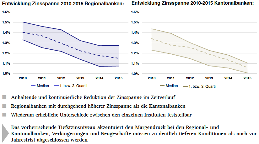 «Das hat zur Folge, dass Verlängerungen und Neugeschäfte zu deutlich tieferen Konditionen als noch vor Jahresfrist abgeschlossen werden müssen», erklärte Thomas Vettiger, Mitgründer und Managing Director der Schweizer Beratungsgesellschaft IFBC, die auch eine entsprechende Erhebung bei den Regionalbanken durchgeführt hat (folgt in einem zweiten Beitrag).