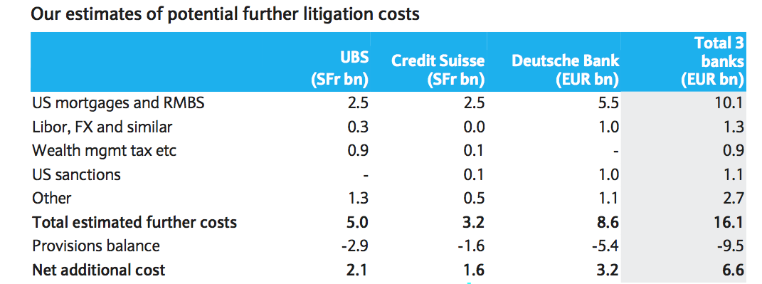Konkret rechnet Sigee damit, dass die Rechtskosten vor allem im Bereich Investmentbanking für die UBS und die CS (und auch die Deutsche Bank) in den nächsten Jahren noch deutlich steigen werden. Allein die Aufwendungen rund um die in der Finanzkrise toxisch gewordenen hypothekenbesicherten Papiere (RMBS) könnten für die Schweizer Grossbanken je noch 2 Milliarden Dollar betragen, so der Chefanalyst.