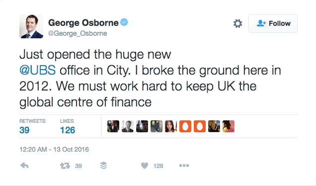 Vier Jahre später, Osborne ist unterdessen bloss noch ein gewöhnliches Parlamentsmitglied, ohne Ministerfunktion in der neuen Regierung von Theresa May, gibt sich der Politiker verhaltener. Von der Eröffnung liess er auf Twitter verlauten: «Wir müssen hart daran arbeiten, das Grossbritannien das globale Finanzentrum bleibt.»