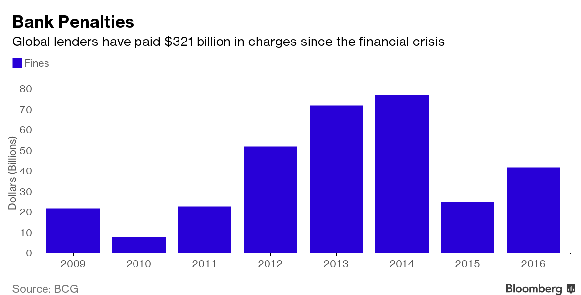 321'000'000'000 Dollar: So viel Geld haben die Banken seit der Finanzkrise vor knapp zehn Jahren für Bussen und Einigungszahlungen ausgegeben. Auf diese enorme Summe gelangte die weltweit tätige Boston Consulting Group (BCG) in einer neuen Studie, wie die Agentur «Bloomberg» berichtete.