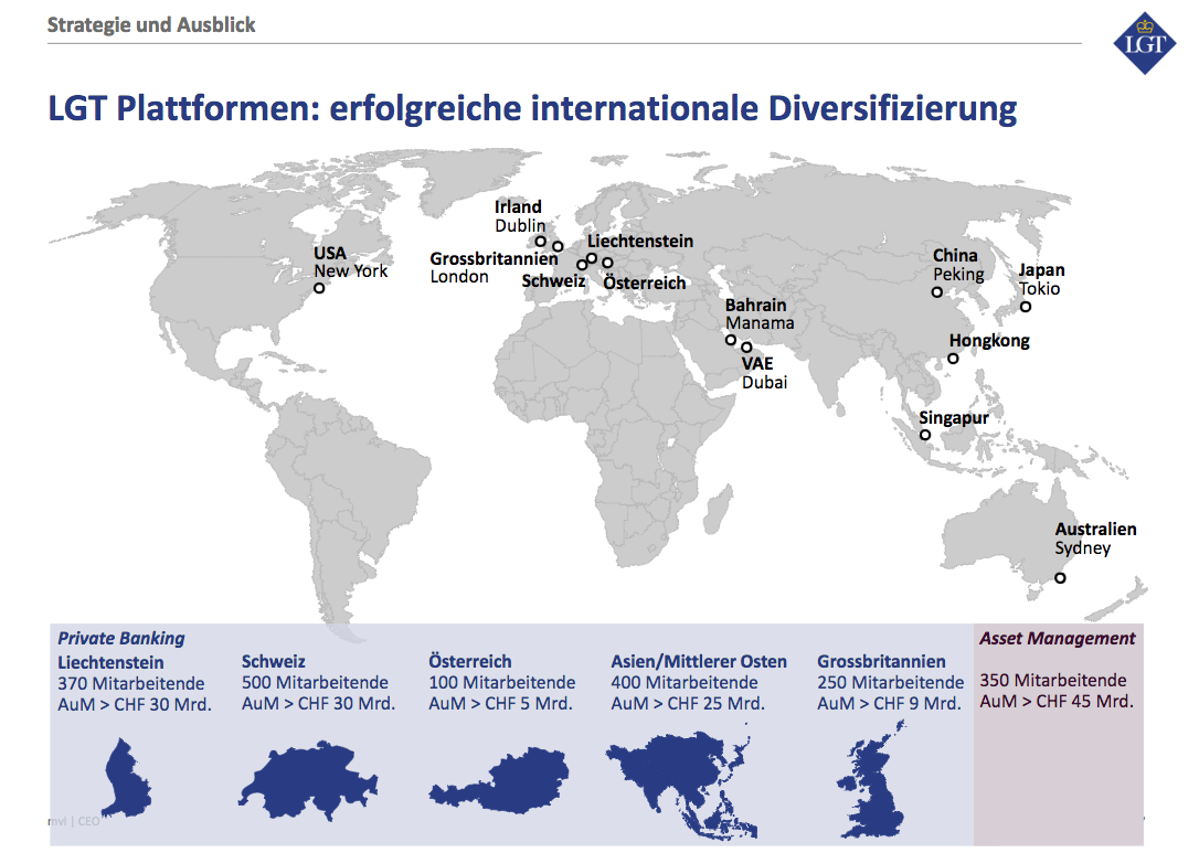 Zum Vergleich: In Liechtenstein verwaltet die Fürstenbank mit rund 370 Private-Banking-Mitarbeitenden über 30 Milliarden Franken. In der Schweiz kümmern sich 500 LGT-Banker um die in etwa gleiche Summe. Insgesamt verwaltete die Bank per Ende 2016 mit 2'632 Mitarbeitenden weltweit 152 Milliarden Franken.