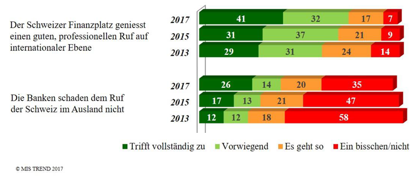 Bestätigt wird das Resultat durch die Feststellung, dass immer weniger Schweizerinnen und Schweizer denken, die Banken würden dem Ruf der Schweiz schaden. Während 2013 noch eine besorgniserregende Mehrheit dieser Meinung war, glaubt das heute nur noch etwas mehr als ein Drittel der Bevölkerung.