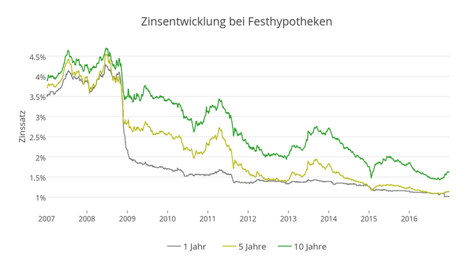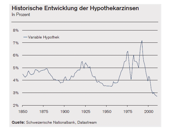 Das zeigt das Beispiel der Berner Regionalbank Valiant. Verlangte das Institut Ende März 2007 noch 4 Prozent Zinsen auf einer zehnjährigen Festhypothek, so waren es im letzten März noch 1,66 Prozent. Bei fünfjährigen Festhypotheken sank der Zins in derselben Frist von 3,85 auf 1,20 Prozent.