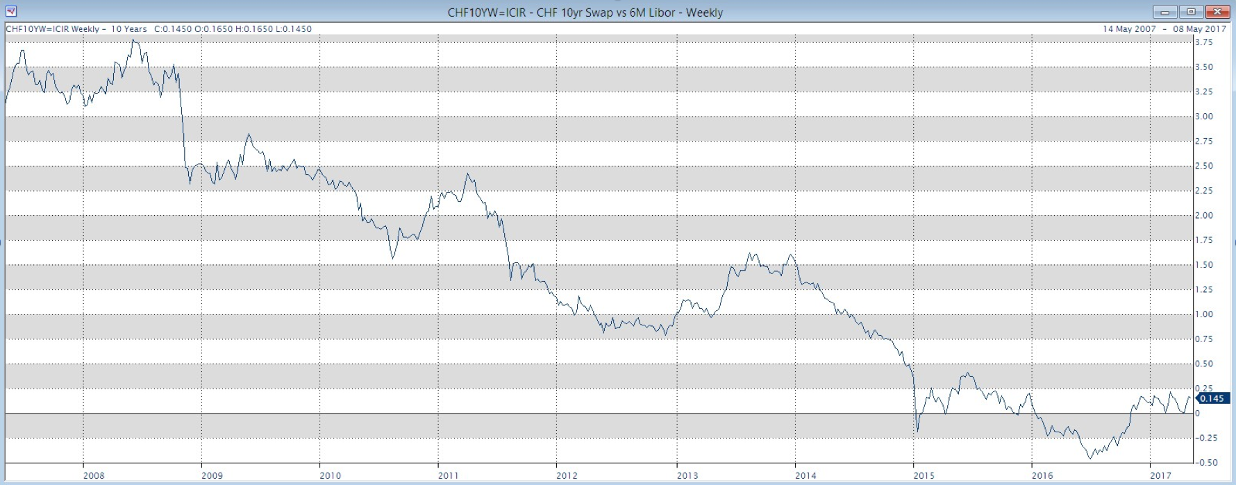 Valiant koppelt seine Preisgestaltung wie die meisten anderen Institute an den Interest-Rate-Swap-Zinssatz. Dieser fiel 2016 auch bei den zehnjährigen Laufzeiten in den negativen Bereich (siehe Grafik unten).