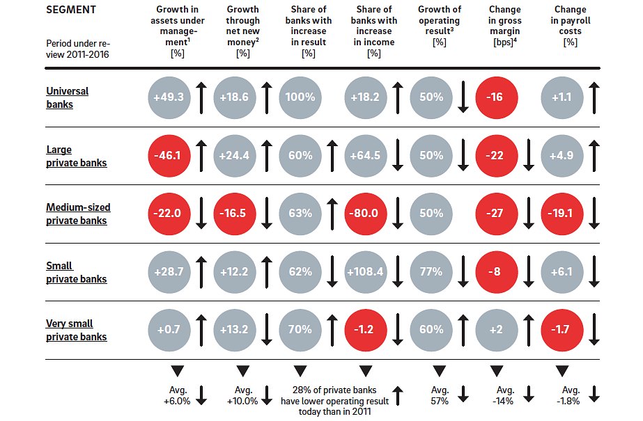 Die gute Nachricht ist: Die verwalteten Vermögen der in der Studie berücksichtigten Schweizer Privatbanken sind dank positiven Märkten 2016 dennoch angestiegen, von rund 5'100 auf 5'400 Milliarden Franken. Doch auch hier gehören die mittelgrossen Banken zu den Verlierern. Ihre verwalteten Vermögen schrumpften um 7,1 Prozent.