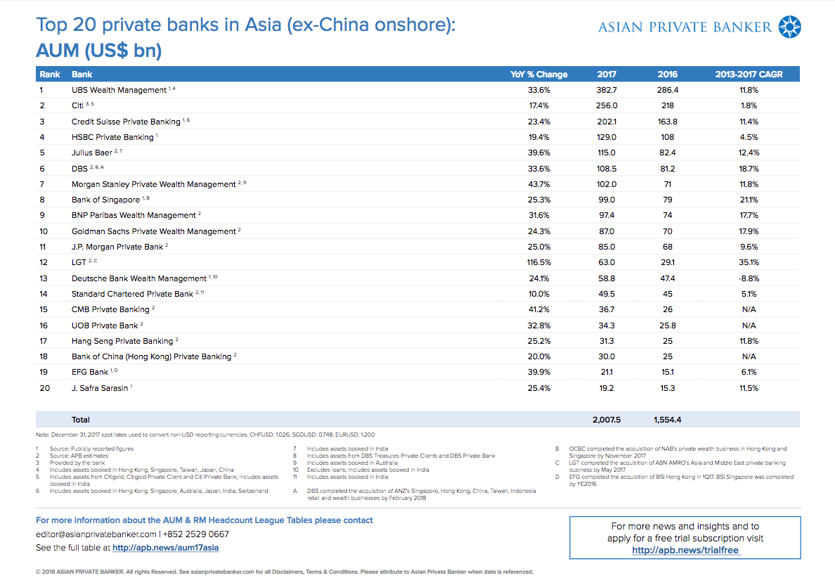 Generell ist das Ranking mit einiger Vorsicht zu geniessen, da es sich bei vielen Zahlen um Schätzungen handelt, da nach wie vor zahlreiche, global tätige Banken ihre regionalen Kundenvermögen nicht publizieren. Das gilt unter anderem auch für Julius Bär, wobei man in dem Fall in Branchenkreisen weiss, dass die Zürcher Traditionsbank in Asien rund ein Viertel ihrer Depots betreut; per Ende entsprach diese einem Volumen von 115 Milliarden Dollar, was einem Plus von knapp 40 Prozent entspricht.