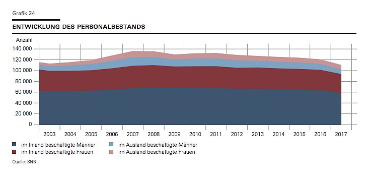 Ende 2017 beschäftigten die Schweizer Banken noch 93'555 Angestellte. Das ist ein dramatischer Rückgang von 7,7 Prozent im Vergleich zum Vorjahr, wie einer Mitteilung des Arbeitgeberverbandes der Banken der Schweiz zu entnehmen ist. Damit sank der Mitarbeiterbestand bei Banken im vergangenen Jahr erstmals seit statistischer Erfassung unter die Marke von 100'000.