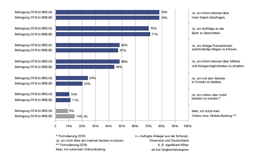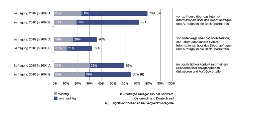 Und nicht nur von jungen (in der Befragung < 49 Jahre), männlichen Befragten werden Online-Zugänge für die Übermittlung von Bankaufträgen und Depotabfragen verstärkt nachgefragt, wie Scheyer weiter feststellt. «Auch ältere (in der Befragung > 60 Jahre) und weibliche Privatanleger sind zunehmend von den Vorzügen der Online-Kanäle überzeugt», sagt die Finanzexpertin und folgert daraus: «Der «Generationen-» und «Gender-Gap», der in den letzten Erhebungen der Studie beobachtet werden konnte, schliesst sich.»
