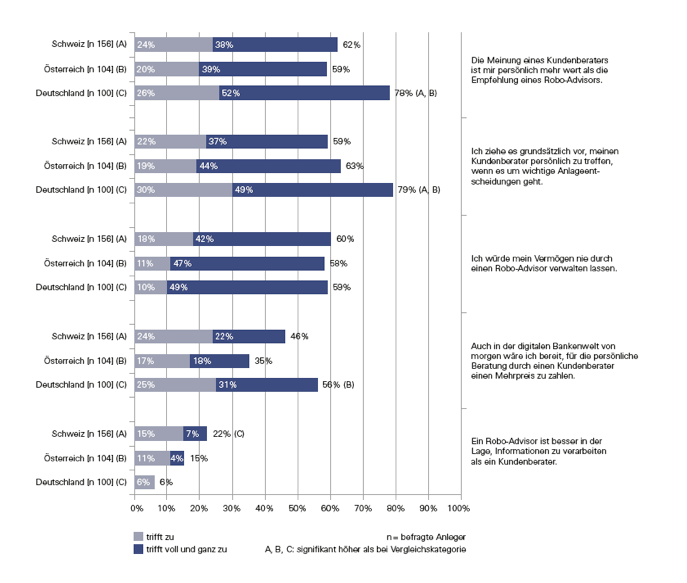 «Für die grosse Mehrheit der vermögenden Anleger ist die Meinung eines Kundenberaters nach wie vor mehr wert als die Empfehlung eines Robo-Advisor», sagt Scheyer. Sie wollen ihren Berater persönlich treffen, wenn es um wichtige Anlageentscheidungen geht. Mehr als die Hälfte der Studienteilnehmer gibt an, dass sie ihr Vermögen nie durch einen Robo-Advisor verwalten lassen würden.