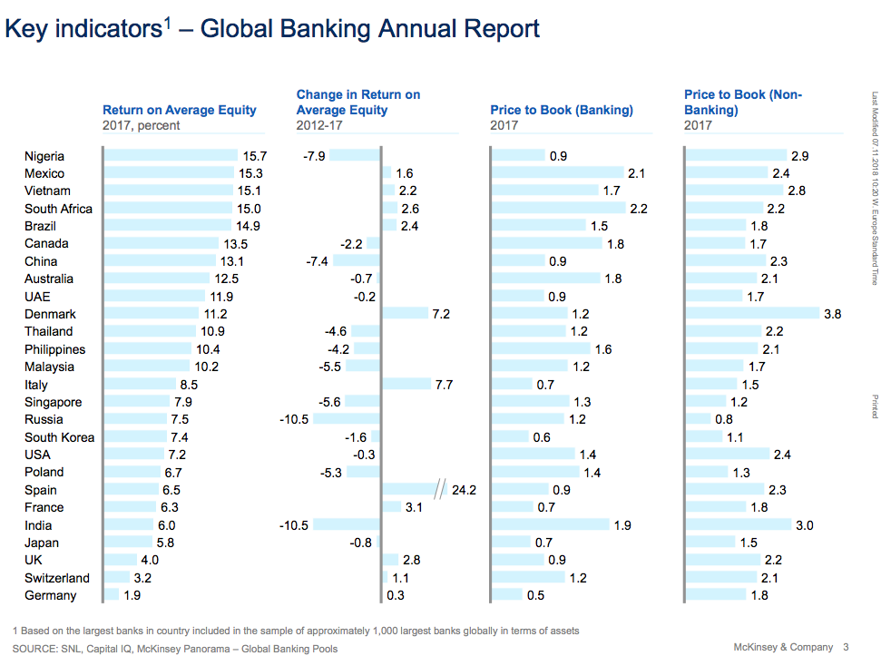 Laut den Beratern spiegelt die tiefe Bewertung das fehlende Vertrauen der Investoren in die Zukunft des Banking wider. Die Anleger, so McKinsey, fragten sich, ob es den Instituten gelingt, aus dem blutleeren Trend auszubrechen und das traditionelle Geschäft neu zu erfinden. Ebenso spielt die Furcht vor der Disruption hinein, welche die Experten teilen.