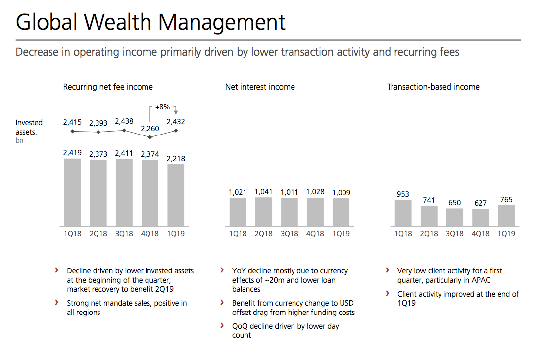 Gut ein Jahr ist die Superdivision nun «im Geschäft» – und hat damit genügend Zeit gehabt, ihre Muskeln zu präsentieren. Doch wie sich zeigt, macht der neue Riese im Konzern derzeit nicht die beste Figur. Das schwierige Jahresende im Vermögensverwaltungs-Business und der noch widrigere Auftakt ins 2019 haben den Giganten sichtlich erschüttert, wie das am Donnerstag publizierte Ergebnis fürs erste Quartal 2019 zeigte.