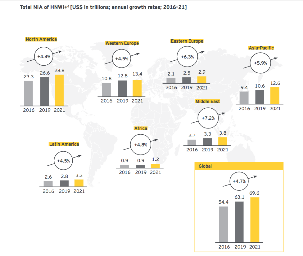 Dafür braucht es Wachstum. Und dazu erscheinen die Staaten ideal. Die Beratungsfirma EY etwa rechnete vor, dass die US-Superreichen bis 2021 mehr als 28'000 Milliarden Dollar an investierten Vermögen auf sich vereinen werden (siehe Grafik unten). Mehr als sonst irgendwo auf der Welt. «Dieser Markt ist extrem attraktiv», so das lapidare Statement der EY-Berater.
