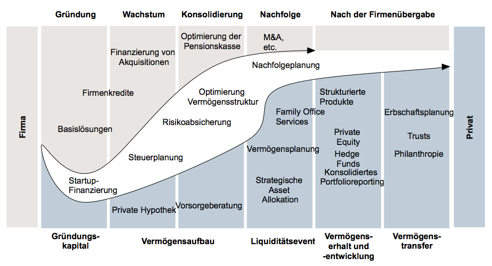 Die Rolle, welche die CS in diesem Geschäftsmodell spielt, illustrieren die Banker anhand einer Grafik (siehe unten), die darstellt, wie die Bank in jedem Lebenszyklus dem Unternehmer unter die Arme greift; zunächst mit Krediten und Finanzierungen, später, langfristig, mit ausgeklügelten Anlagestrategien, um das Vermögen des Unternehmers nachhaltig zu mehren.