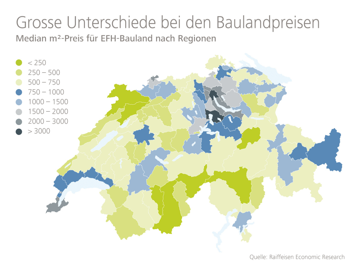 Die regionalen Baulandpreise würden von diesem starken Stadt-Land-Graben zeugen. Während in den Städten Genf, Basel, Zug sowie Zürich und seinem Einzugsgebiet am Seeufer im Schnitt mehr als 2'000 Franken pro Quadratmeter für Einfamilienhaus-Bauland bezahlt werden muss, fänden sich vor allem in der Süd- und Westschweiz viele Regionen, in denen die Preise noch deutlich unter 500 Franken liegen, heisst es in der Studie.