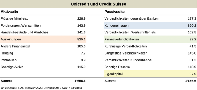 Doch wie sähe ein solcher Zusammenschluss jeweils konkret aus? Legt man die Bilanzen der Deutschen Bank sowie der Unicredit mit jener der CS zusammen, ist sofort ersichtlich, dass eine Fusion der Schweizer Grossbank mit der Deutschen Bank zu einem ernsthaften Mitspieler am Markt führen würde.