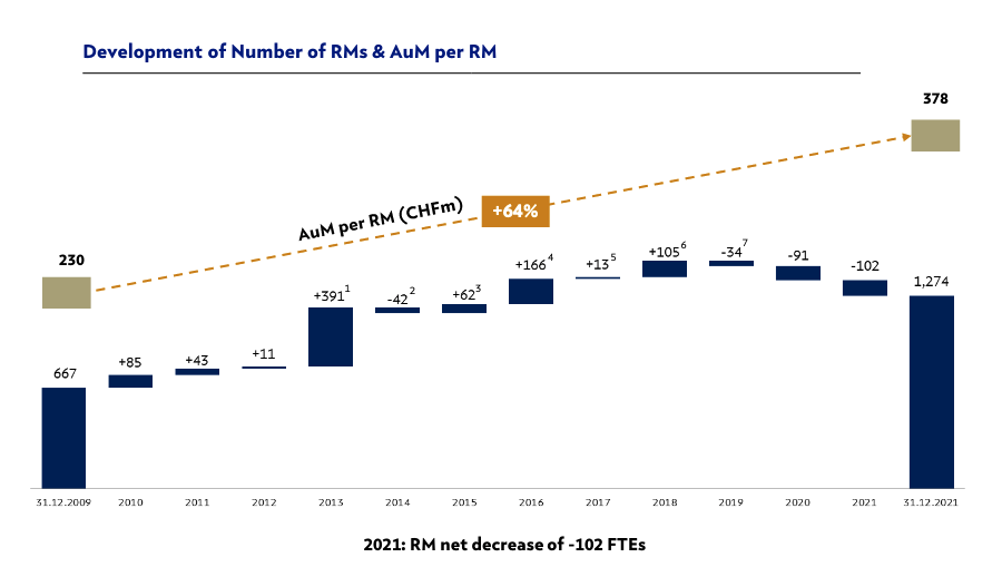 Wie sich aber zeigt, hat die Schar der RMs bei Julius Bär in den vergangenen beiden Rekordjahren unter dem Strich deutlich abgenommen. So verminderte sich ihre Zahl nach Vollzeit-Äquivalenten 2020 um 91 und 2021 gar um 102. Per Ende vergangenen Jahres waren damit noch 1’274 Kundenberater für das Zürcher Institut weltweit tätig (siehe Grafik unten).