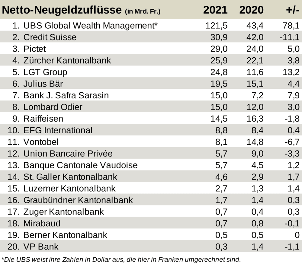 Die diversen Privatbanken liegen allerdings nach wie vor weit hinter den beiden Schweizer Grossbanken zurück, was wiederum die Bedeutung und Dimensionen der UBS und der Credit Suisse (CS) unterstreicht. Allerdings gab es mit Blick auf die beiden «Grossen» im vergangenen Jahr eine aussergewöhnliche Entwicklung: Während die UBS aufgrund ihrer soliden Geschäftsstrategie in Sachen Neugeld markant zulegen konnte, musste die CS gegenüber 2020 einen Rückgang hinnehmen. Dies ist – nicht überraschend – den letztjährigen Skandalen rund um die Greensill-Fonds und die Pleite des US-Hedgefonds Archegos geschuldet. Beide Ereignisse stürzten die CS in eine tiefe Reputationskrise.