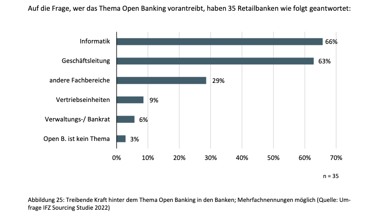 Wie die Studie aber feststellt, wird die Thematik im Swiss Banking trotz all diesen Entwicklungen unterschätzt. Open Banking werde als Problemstellung der Informatik und nicht als strategische Herausforderung verstanden (siehe Grafik unten). In der IT wiederum werde der Fokus allzu schnell auf die Schnittstellen gelegt und dabei übersehen, dass mit Open Banking auch grundlegende Veränderungen auf die Bankinformatik zukommen.