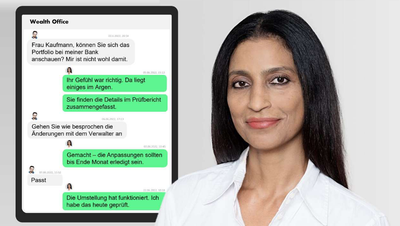 Jedem sein eigenes Wealth Office: Das ist das neueste Versprechen der umtriebigen Zürcher Vermögensberater von Zwei Wealth. Dazu lancieren sie ein neues Digitalangebot, das auf dem PC oder Smartphone die wesentlichen Funktionen einer unabhängigen Betreuung abbildet – inklusive Chat (siehe Grafik unten) mit der persönlichen Beraterin und einem Tool für die Ausschreibung von Verwaltungsaufträge an Asset Manager und Banken.