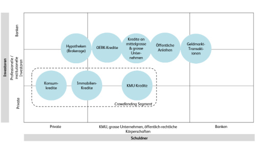 Anstelle von Banken bieten sich auf diesen Plattformen verschiedene Privatpersonen oder professionelle und institutionelle Investoren als Kreditgeber an, darunter Versicherungen, Fonds, Pensionskassen, Banken oder Family Offices. Die Vertriebsplattformen selbst nehmen keine Einlagen entgegen und vergeben selbst auch keine Kredite über eine eigene Bilanz, sondern sie kassieren «lediglich» von beiden Seiten eine Gebühr für ihre Dienstleistung.