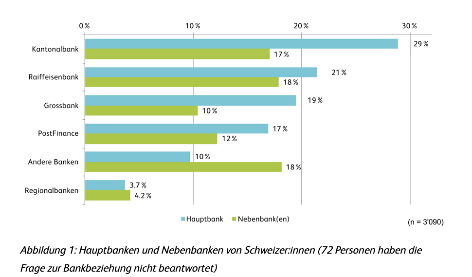 In der Tendenz an Bedeutung als Hauptbank eingebüsst haben hingegen die Raiffeisen-Banken und die Regionalbanken mit Anteilen mit 21 und 3,7 Prozent. In der Erhebung vom Vorjahr lagen die Werte noch bei 24 respektive 7 Prozent. Nicht mehr erhoben hat das IFZ den Anteil der Digitalbanken, der trotz Zugewinnen noch unter der 1-Prozent-Schwelle gelegen hatte.