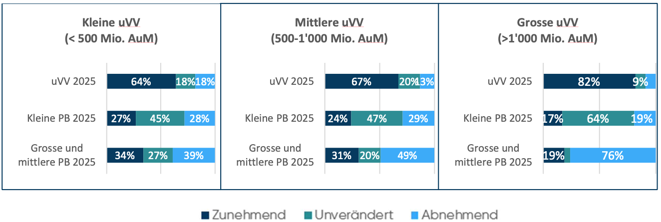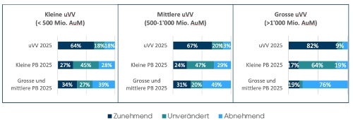Die Studienteilnehmenden erwarten, dass die EAM-Marktanteile auf Kosten grosser und mittlerer Privatbanken wachsen werden (siehe Grafik unten). So geht die Hälfte der Umfrageteilnehmenden von einem Marktanteilsverlust solcher Geldhäuser aus, welche einerseits als Depotbanken wichtig, anderseits auch die primären Wettbewerber von EAM bei der Beratung einer wohlhabenden Kundschaft sind. Insbesondere die grossen EAM, welche über 1 Milliarden Franken an verwalteten Vermögen aufweise, wollen mittleren und grossen Privatbanken Kundenberater abwerben.