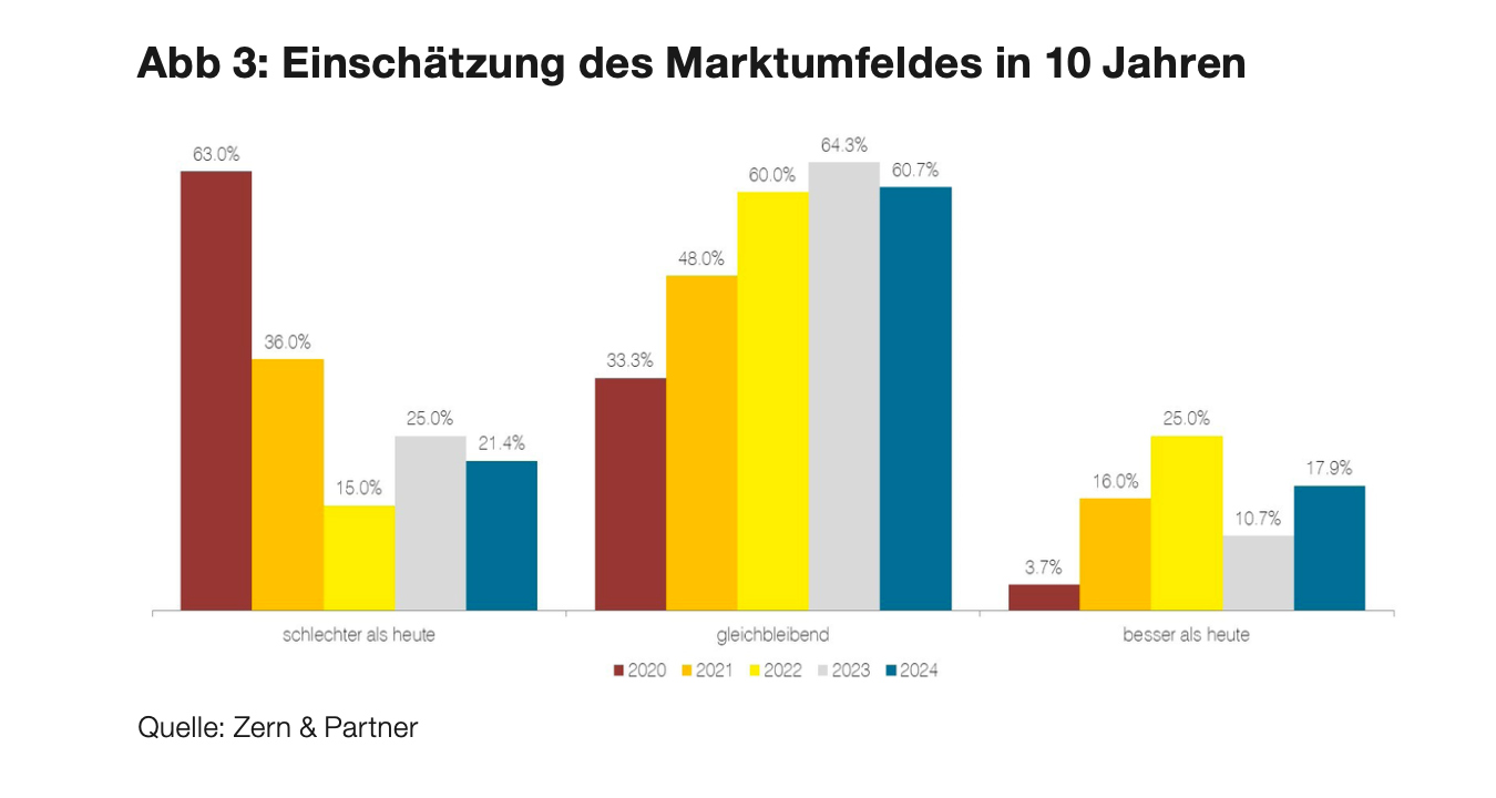 Bei der Frage, wie sich das Marktumfeld für die Regional- und Kantonalbanken in zehn Jahren verändern wird, antworten 18 Prozent «besser als heute». Das sei beachtlich und der zweitbeste Wert der letzten fünf Jahre, heisst es in der Studie. Dagegen sagen gut 21 Prozent «schlechter als heute», was wiederum der zweitniedrigste Wert der vergangenen fünf Jahre ist.