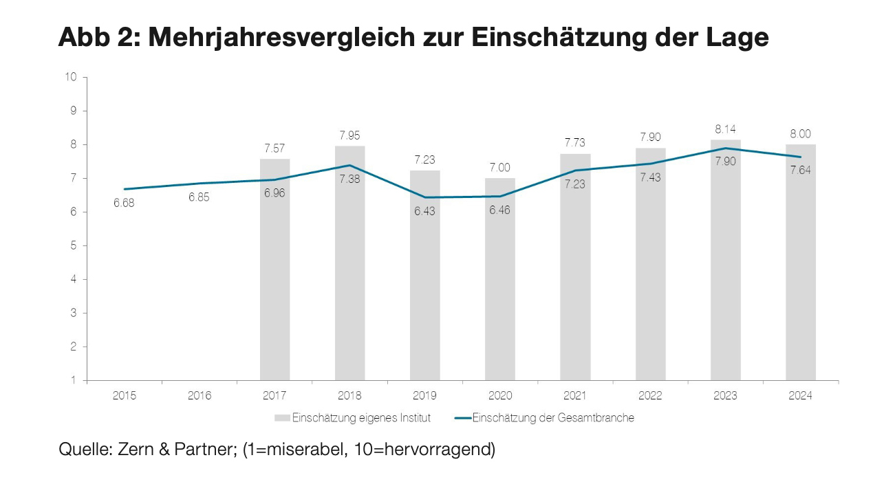 Die Einschätzung der Lage auf einer Skala bis zehn Punkten ist positiv, aber etwas tiefer als im Vorjahr. Im Vergleich zum Rekord 2023 mit 7,90 kommt ein Durchschnittswert von 7,64 heraus. Die Einschätzung der Lage des eigenen Instituts fällt mit 8,00, wie jedes Jahr, etwas höher aus. Gegenüber dem Vorjahreswert von 8,14 liegt der Wert jedoch ebenfalls etwas tiefer.