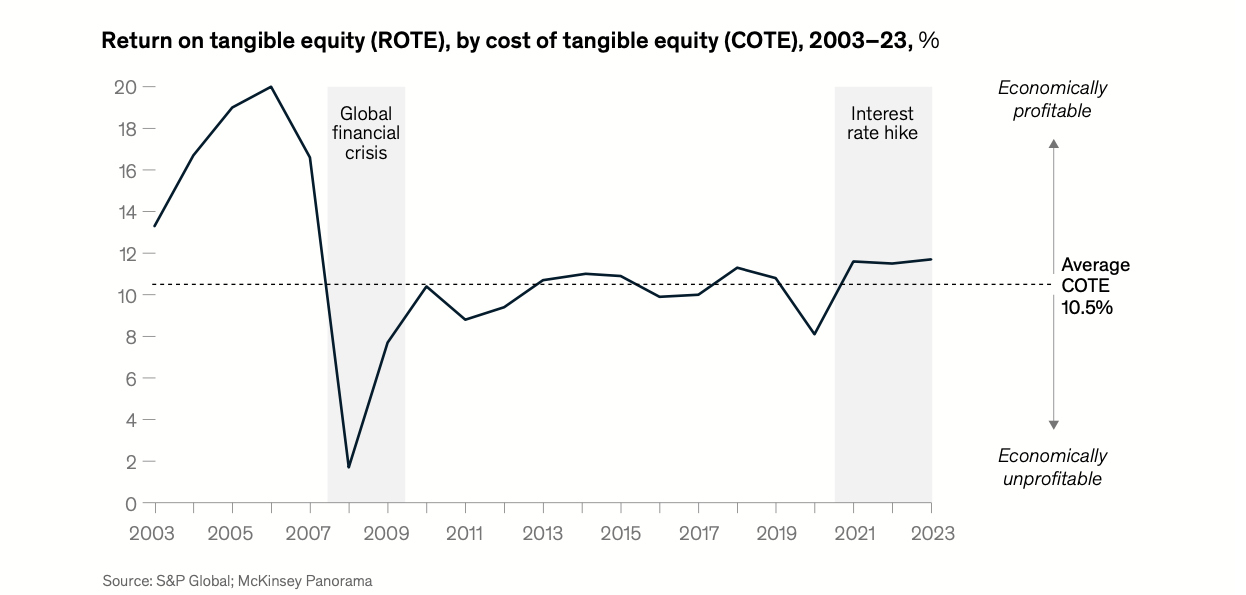 Global fuhren die Banken 2023 Gewinne von 1,15 Billionen Dollar ein. Das war ein Plus von 8 Prozent zum Vorjahr. Damit sei die Branche eine der profitabelsten überhaupt. Auch bei der Profitabilität habe sich die Branche mit Gesamterträgen von 6,8 Billionen Dollar und einer durchschnittlichen Eigenkapitalrendite (ROTE) von 11,7 Prozent (2022 11,5 Prozent) weiter verbessert.