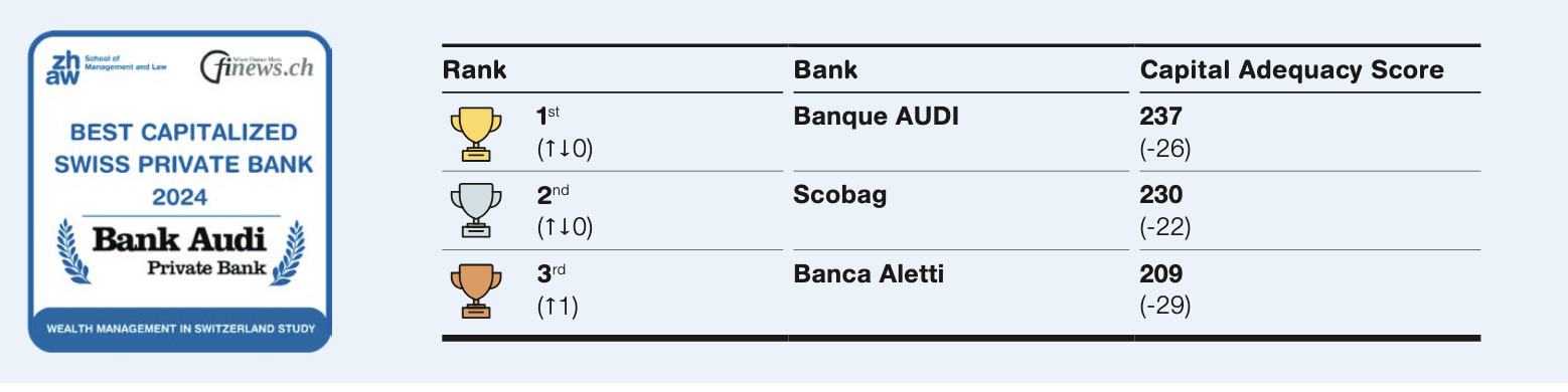 Für die Bestimmung der bestkapitalisierten Privatbank untersuchte die ZHAW die CET1-Ratio sowie die ungewichtete Eigenmittelquote (Leverage Ratio) und die Liquiditätsdeckungsrate (Liquidity Coverage Ratio). In dieser Kategorie erzielte die Genfer Banque Audi das höchste Resultat.