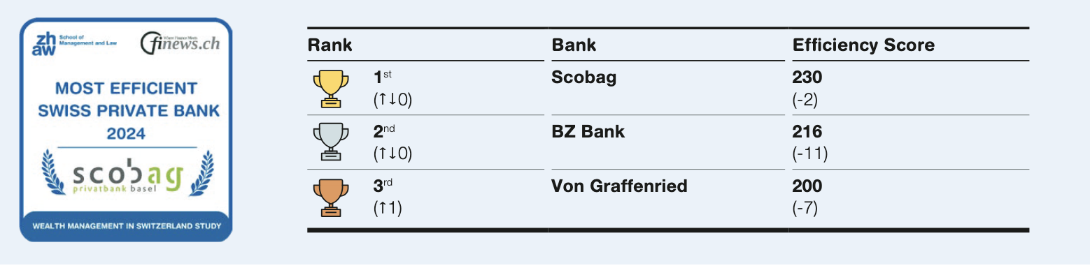 Die Effizienz einer Privatbank ermittelte die ZHAW anhand des Kosten-/Ertragsverhältnisses, also der Masszahl zwischen jedem eingenommenen Franken und den dafür angefallen Kosten; weitere Kriterien waren das Verhältnis von Kundengeldern und Anzahl Beschäftigte respektive den Personalkosten im Verhältnis zu jedem Mitarbeitenden. In dieser Kategorie schnitt die Basler Privatbank Scobag am besten ab.