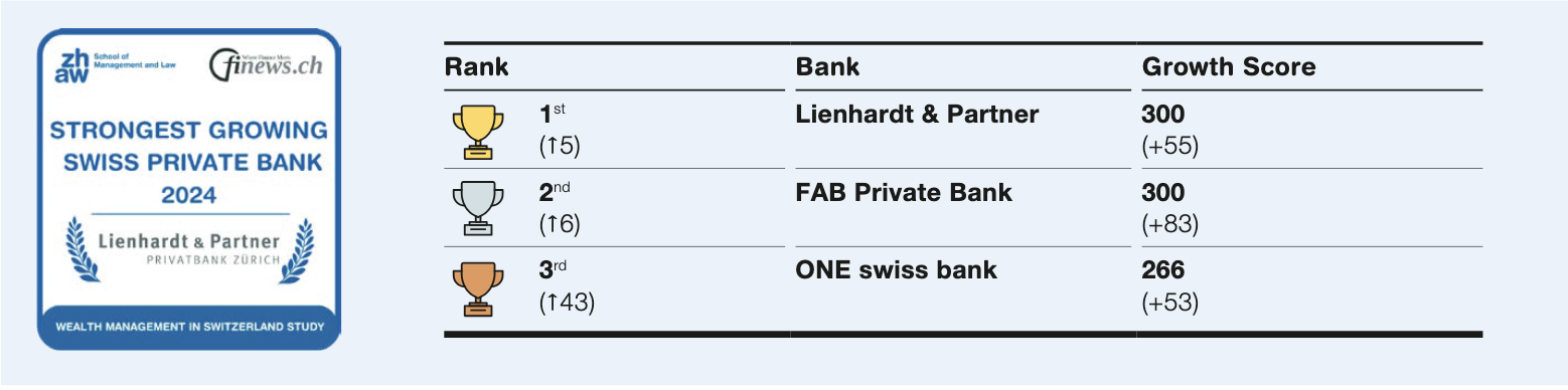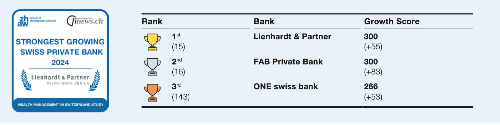 Wie die Ergebnisse der Studie, die finews.ch exklusiv vorliegt, schnitt in der Kategorie «Wachstum» die Zürcher Privatbank Lienhardt & Partner am besten ab. Im Fokus der Analyse standen dabei die Kundengelder sowie das Wachstum der neu zugeflossenen Mittel (Net New Money), unter anderem im Verhältnis zu den Mitarbeitern.