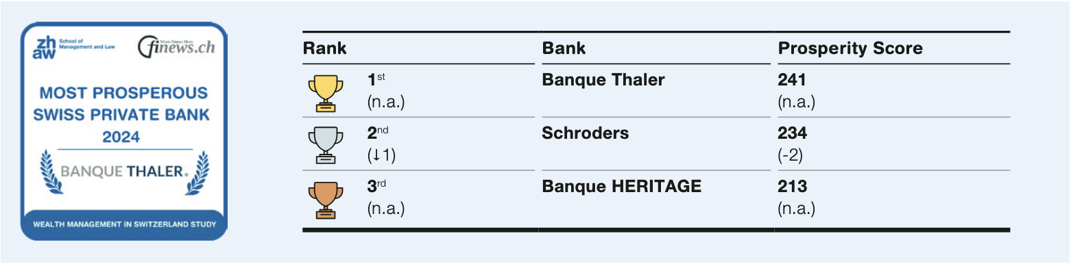 In der Kategorie «Prosperität», die auf den Renditezahlen der Aktiva, der Kundengelder und dem Eigenkapital beruhte, belegte die Genfer Banque Thaler den ersten Platz.