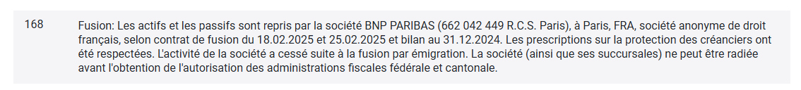 Wie aus dem Handelsregister und dem Schweizerischen Handelsamtsblatt hervorgeht, hat BNP Paribas Paris sämtliche Aktiven und Passiven von BNP Paribas (Suisse) am 12. Mai 2025 übernommen. Die Tätigkeit von BNP Paribas (Suisse) wurde infolge dieser «grenzüberschreitenden Übernahme» eingestellt, und die Gesellschaft wird gelöscht.