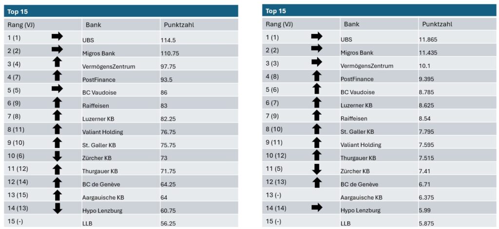 Sowohl gewichtet als auch ungewichtet liegen die VZ Depotbank und PostFinance auf den Plätzen 3 und 4. «Besonders PostFinance verzeichnet im Vergleich zum Vorjahr einen deutlichen Fortschritt», heisst es weiter. Die Credit Suisse, die 2024 noch Rang 4 belegt hatte, wurde nicht mehr berücksichtigt. Die BCV behauptet den fünften Rang.