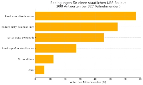 In Krisen immer umstritten ist die Frage, welche Auflagen gelten sollen, wenn der Staat Steuergelder einsetzt, um eine Bank zu retten. Am meisten Anklang (71 Prozent) findet die Bedingung, die Boni und Vergütungen der Führungskräfte zu begrenzen. Ebenfalls eine Mehrheit findet mit 67 Prozent die Forderungen nach einer Rückzahlung von vom Verwaltungsrat bereits bezogenen Gehältern und Boni (Clawback) sowie nach einer Reduktion riskanter Geschäftsbereiche (57 Prozent). Für eine staatliche Beteiligung bzw. für eine Zerschlagung der Bank sprechen sich 28 bzw. 25 Prozent aus.