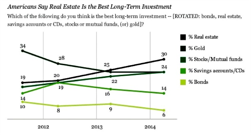 Insgesamt halten derzeit nur noch 24 Prozent der Amerikaner Gold für das langfristig beste Investment. Das Edelmetall wurde jetzt deutlich durch Immobilien eingeholt, wie die folgende Grafik zeigt.