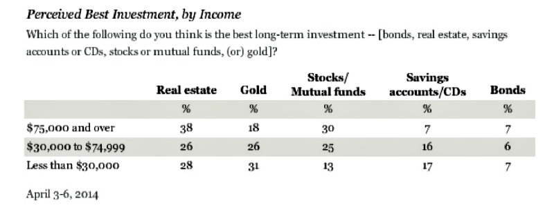 Anders sieht es bei den einkommensstarken Amerikanern aus. Anleger, die mehr als 75'000 Dollar verdienen, setzen viel lieber auf Immobilien (38 Prozent) und Aktien (30 Prozent) als langfristig beste Anlageform. Gold ist mit 18 Prozent weniger beliebt.