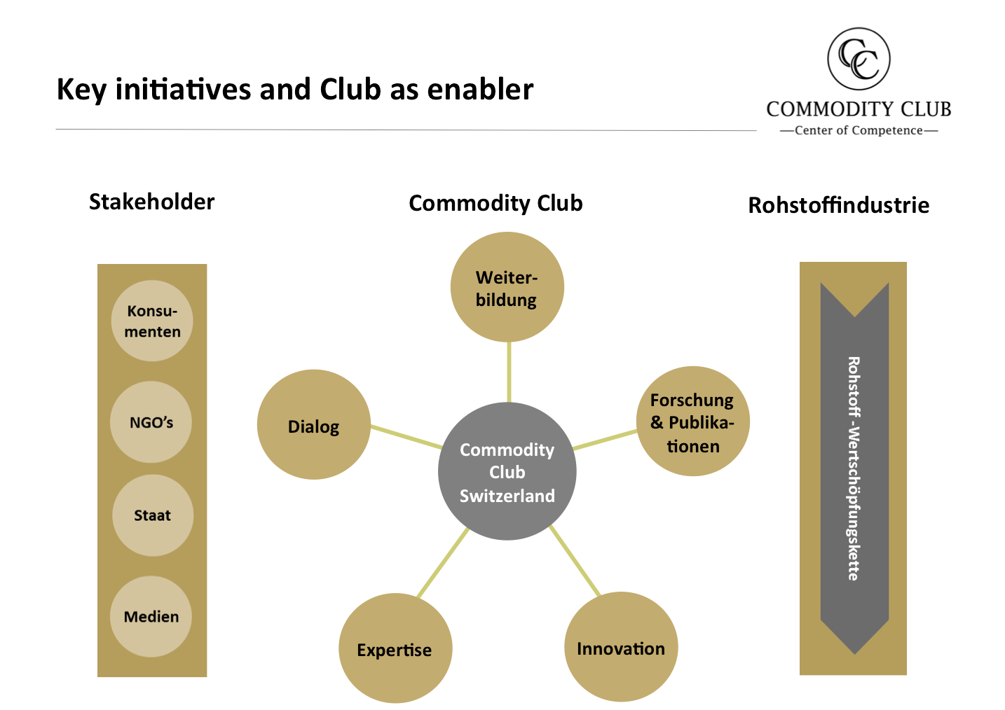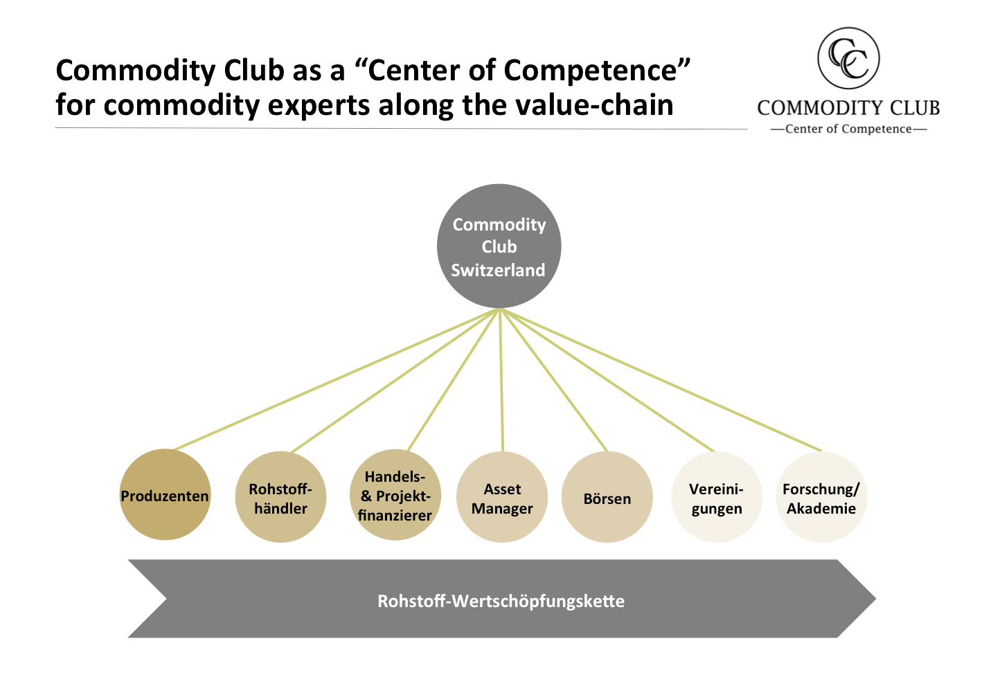 Der Club bringt Experten entlang der gesamten Rohstoff-Wertschöpfungskette zusammen und hat zum Ziel, das Verständnis für die verschiedenen Bereiche des Rohstoffgeschäfts zu fördern. Diese gesamtheitliche Sicht ist einzigartig und verschafft den Mitgliedern einen eindeutigen Mehrwert (vgl. Grafik).