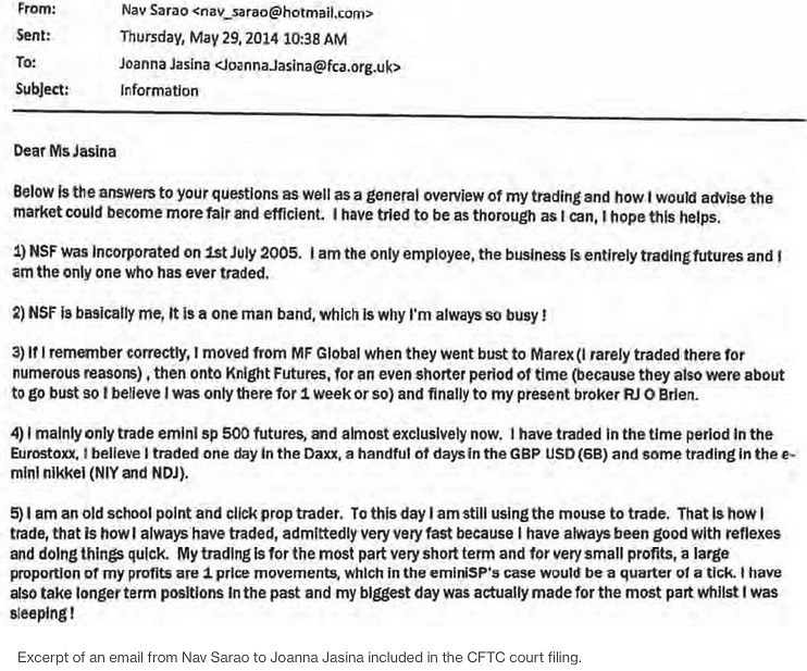 In einem der Nachrichtenagentur «Bloomberg» vorliegenden Schreiben an die britische Aufsichtsbehörde von 2014 zeigen sich auch humorvolle, wenn nicht sarkastische Züge Saraos.