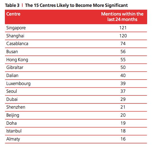 Die asiatischen Finanzzentren dürften gemäss Einschätzung der knapp 3'200 Befragen auch in den kommenden fünf Jahren weiter an Bedeutung gewinnen. So liegen 8 der 15 aussichtsreichsten Finanzplätze in Asien. (siehe Tabelle).