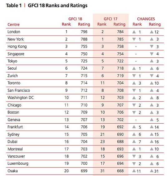Die Plätze an der Spitze getauscht haben erneut New York und London. Die britische Metropole ist nun wieder der bedeutendste aller 84 bewerteten Finanzplätze, nachdem es im Frühjahr noch New York gewesen war. Unverändert die asiatischen Finanzhubs: Hongkong liegt nach wie vor knapp vor Singapur und Tokyo.