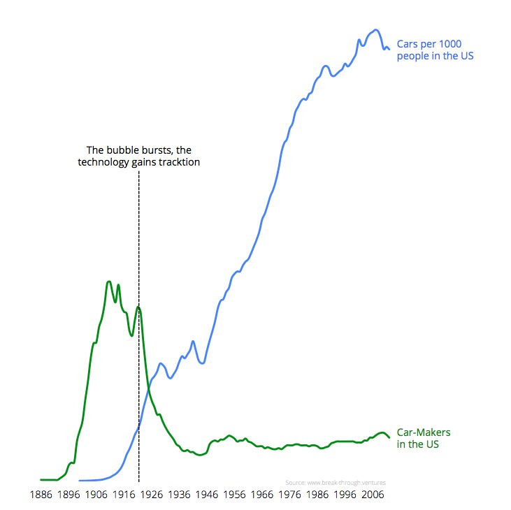 Nehmen wir das Automobil: Im Jahr 1886 präsentierte Gottlieb Daimler den ersten Daimler-Wagen (eine Kutsche mit Motor). Doch die Menschen vertrauten erstmal weiterhin Pferden. In den USA versuchten sich hunderte Unternehmen daran, der Masse das Automobil schmackhaft zu machen.