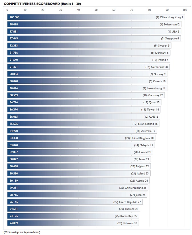 Den zweiten Platz für die Schweiz begründete Artur Bris, Direktor des IMD World Competitiveness Center, damit, dass sich die kleine Volkswirtschaft voll und ganz zur Qualität bekannt habe. Damit konnte die Schweiz schnell auf den Frankenschock des vergangenen Jahres reagieren und ihre Wirtschaft auf höchstem Niveau halten.