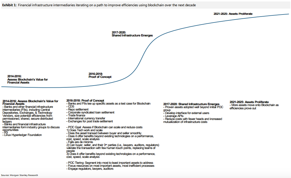 Kürzlich hat dazu die amerikanische Grossbank Morgan Stanley eine Studie veröffentlicht. Diese erwartet die Einführung der potenziell disruptiven Technologie schön nach Fahrplan (siehe Grafik unten). Der Studie zufolge werden bis 2018 die Möglichkeiten der Blockchain getestet; bis 2020 wird dann eine gemeinsame Infrastruktur aufgebaut – und bis 2025 immer mehr Marktvolumen auf die neuen Systeme verschoben.