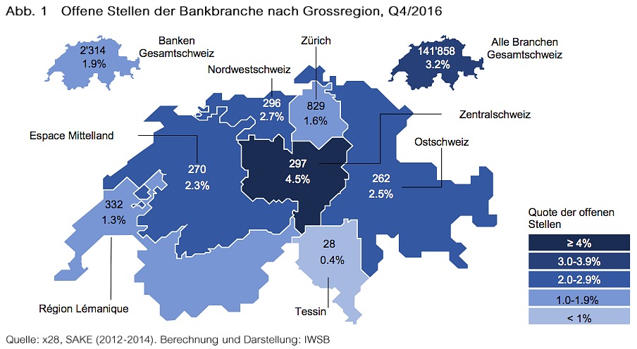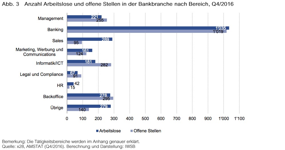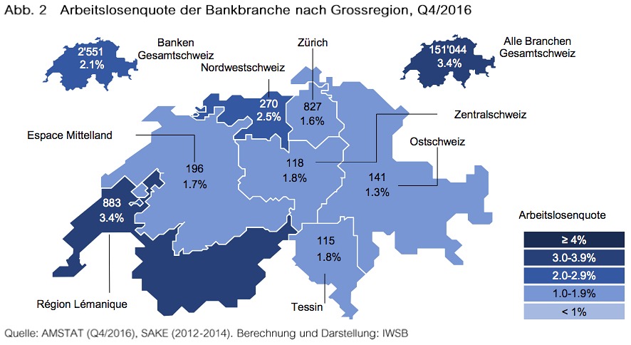 Die Arbeitslosigkeit in der Bankbranche hat auch im Schlussquartal 2016 weiter zugenommen. Die Unterschiede zwischen den verschiedenen Regionen und Bankbereichen sind teils markant.